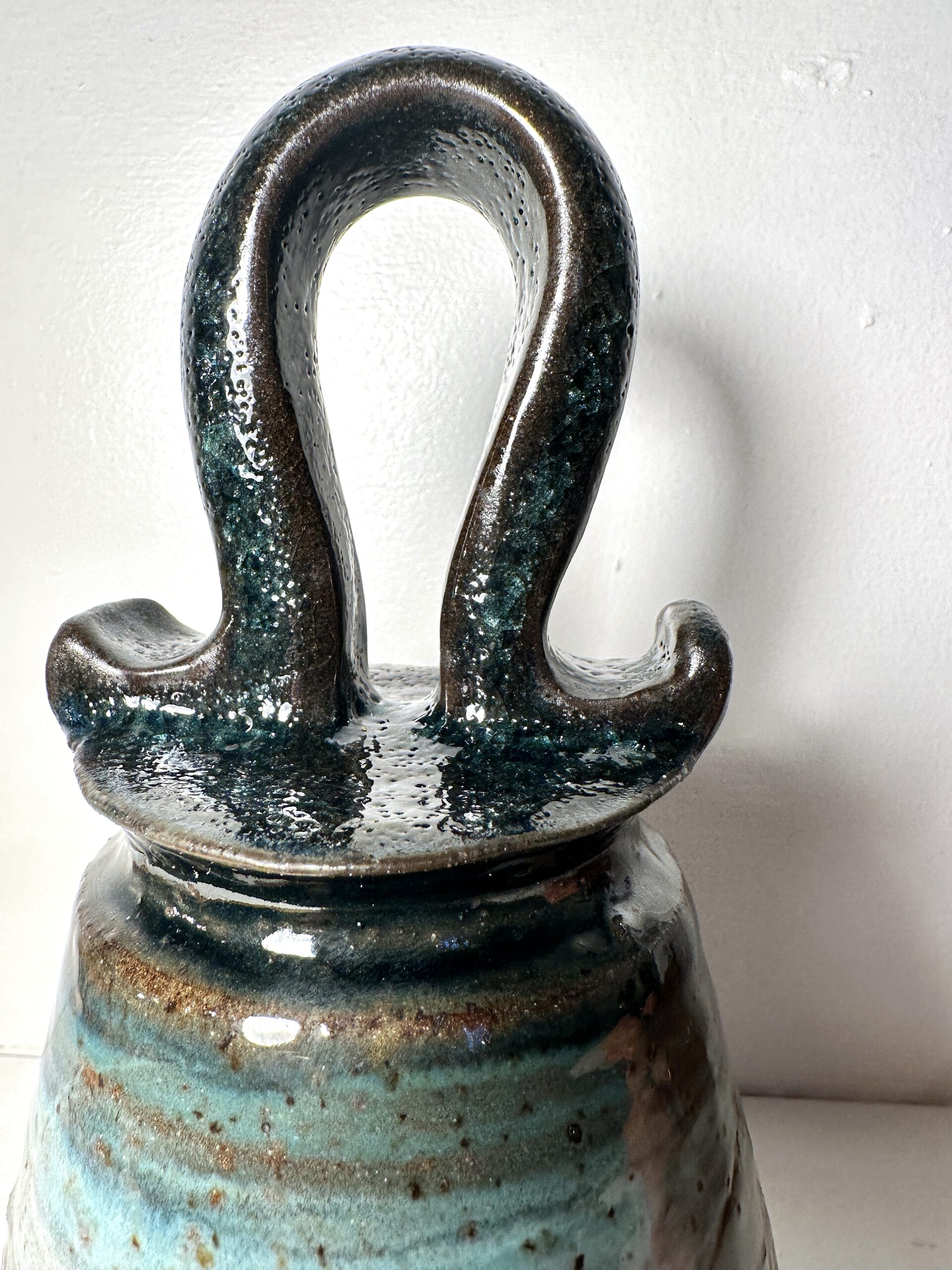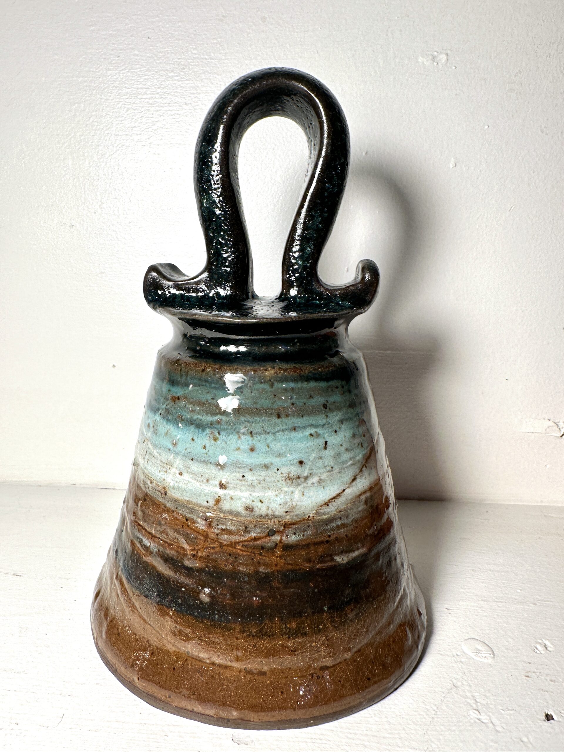 Beautiful deep rich tone bell made of Kentucky Clay. Large bell, 5″. 7″ tall.