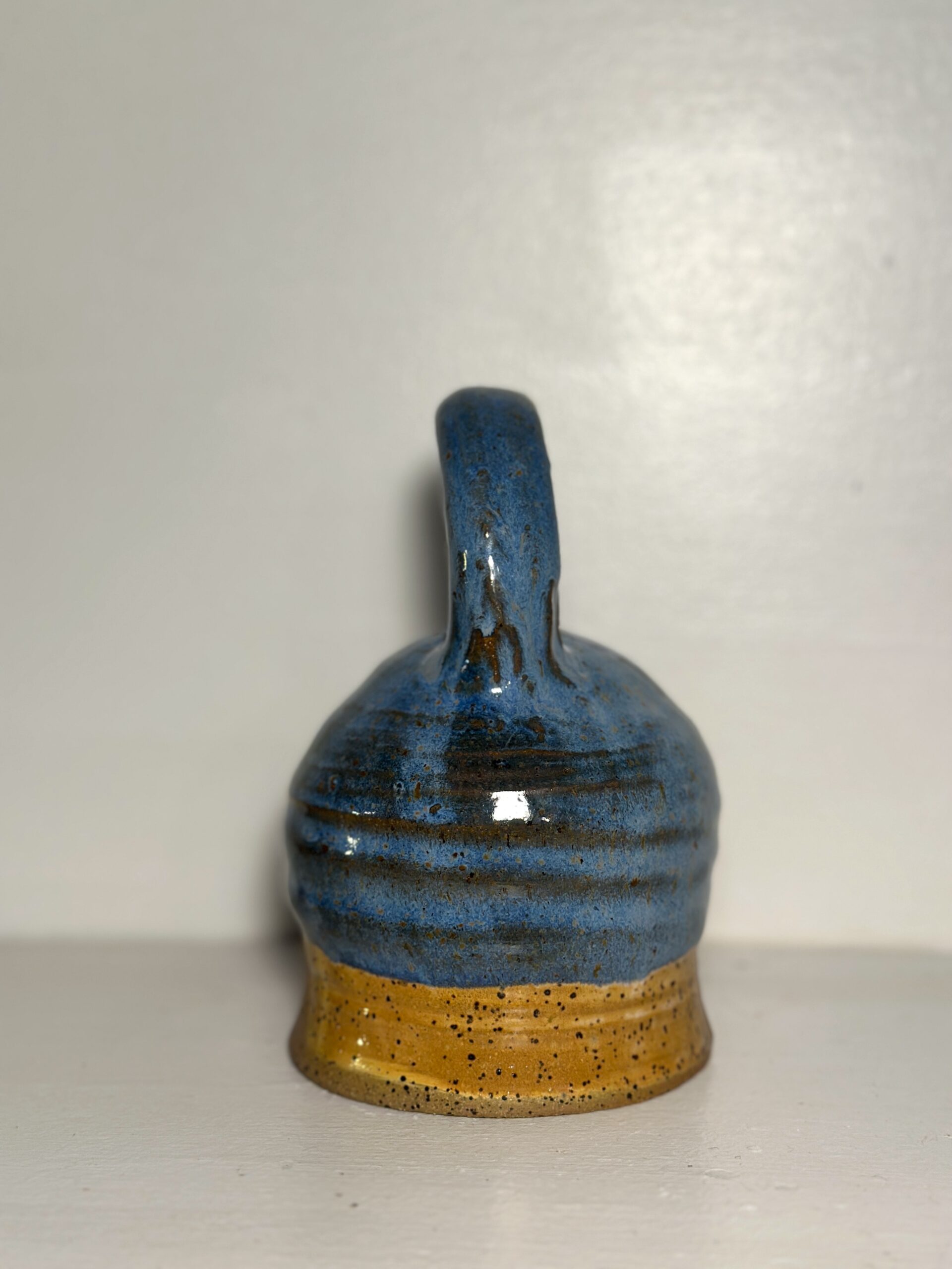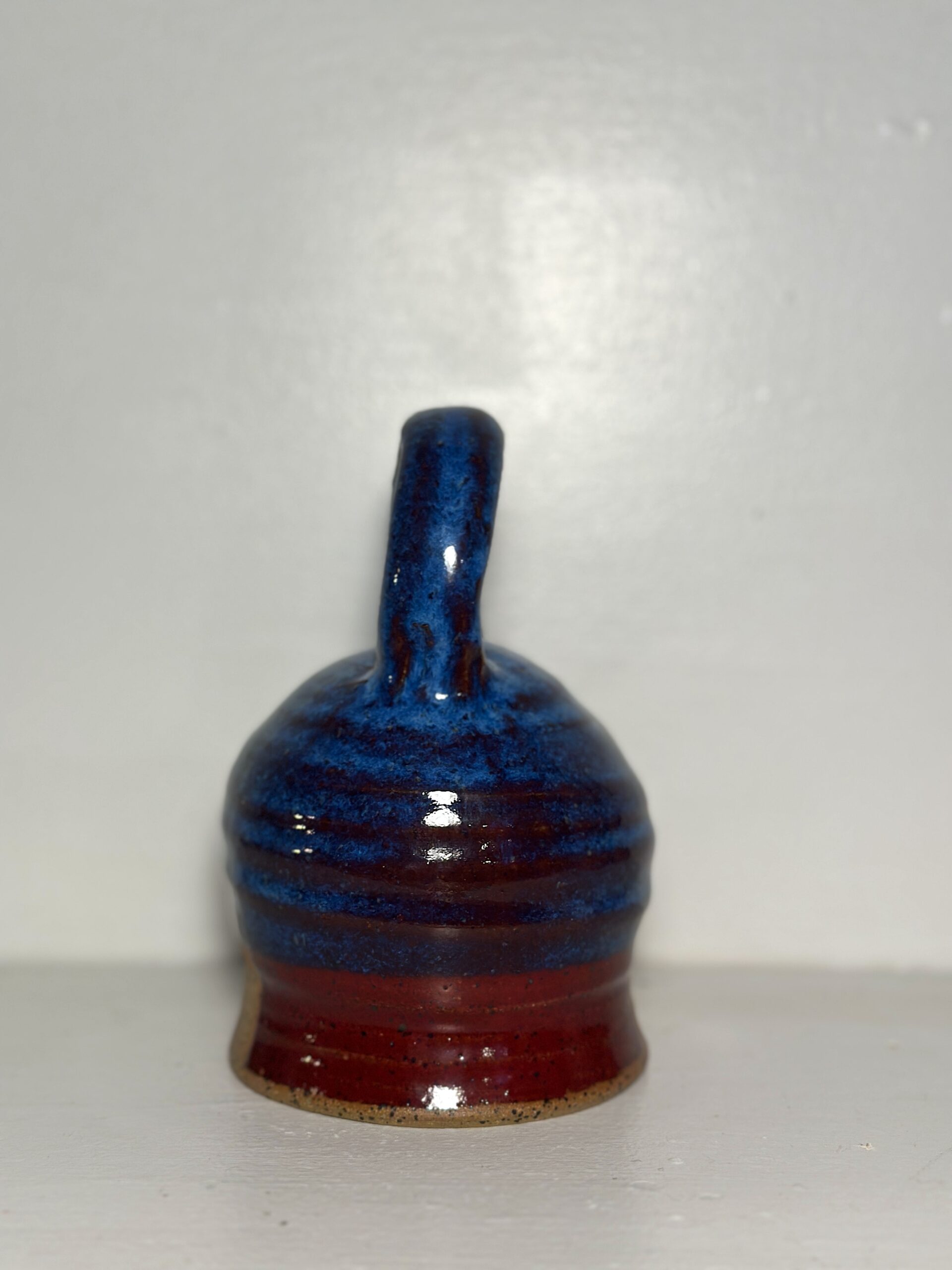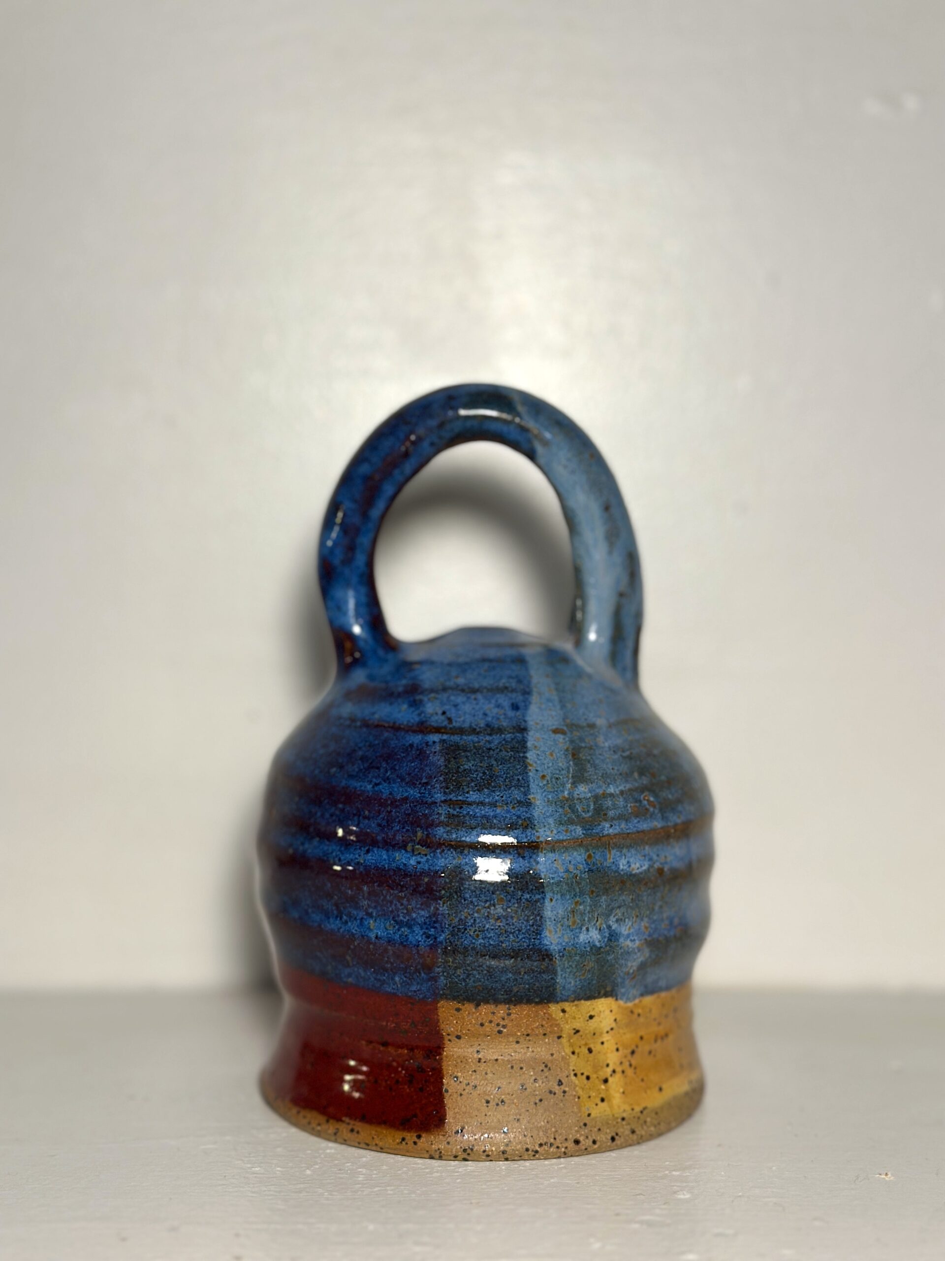 Beautiful Kentucky Mudworks clay, red yellow blue dip glazes overlap to show the richness of stoneware. This handbell is large, 5-1/2″ tall by 4″ round. The tone is full and long lasting. One of my favorites so far, a lovely example of function and form. Shipping Included.